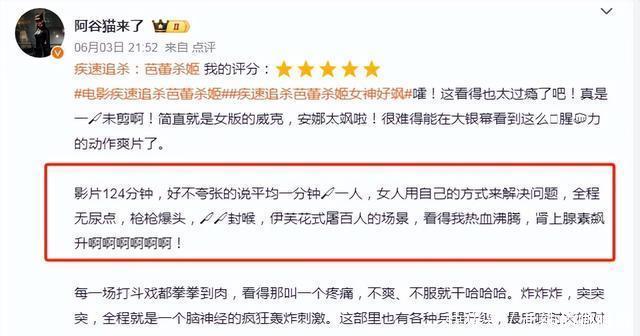 有不雅众看完怡悦打五星“影片124分钟,平均一分钟杀一东谈主,女东谈主用我方的格局来处分问题,全程无尿点,枪枪爆头、刀刀封喉,伊芙表情屠百东谈主的场景,看得我扬眉吐气,肾上腺素飙升。”
