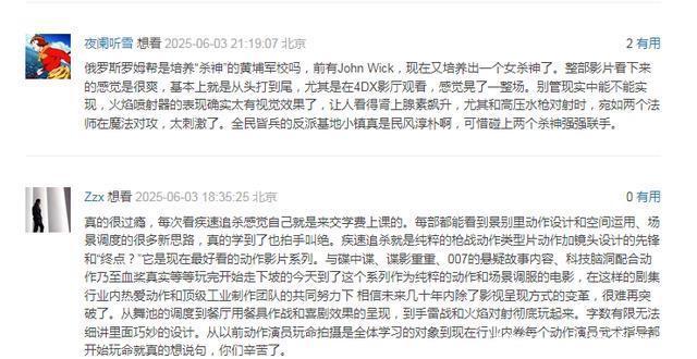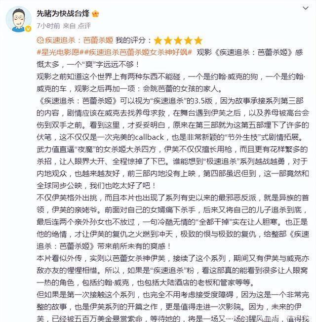 驰名影评东谈主战台烽暗示这一部是系列电影“添枝接叶式的剧情拓展”,女主角伊芙不单是擅长用枪,况兼更有表情繁多的杀招,让东谈主眼界打开、全程惊掉下巴。以及提到了电影出现了“系列有史以来的最狂暴邪派”,相配绝情,这么的一个东谈主让复仇更过瘾,前所未有的爽感。