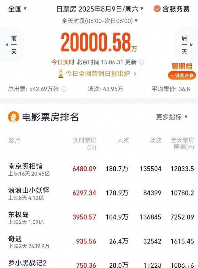 据网罗平台数据 规模本日15时06分 8月9日单日电影票房已破2亿 抗战题材电影《南京影相馆》赓续领跑