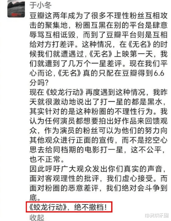 一篇小作文件给一又友圈,径直内涵豆瓣粉丝,并暗示“《蛟龙行径》毫不撤档”。