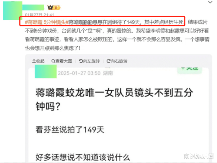 据粉丝暗示,蒋璐霞拍了快五个月,在点映礼现场才看到我方戏份被剪成五分钟。