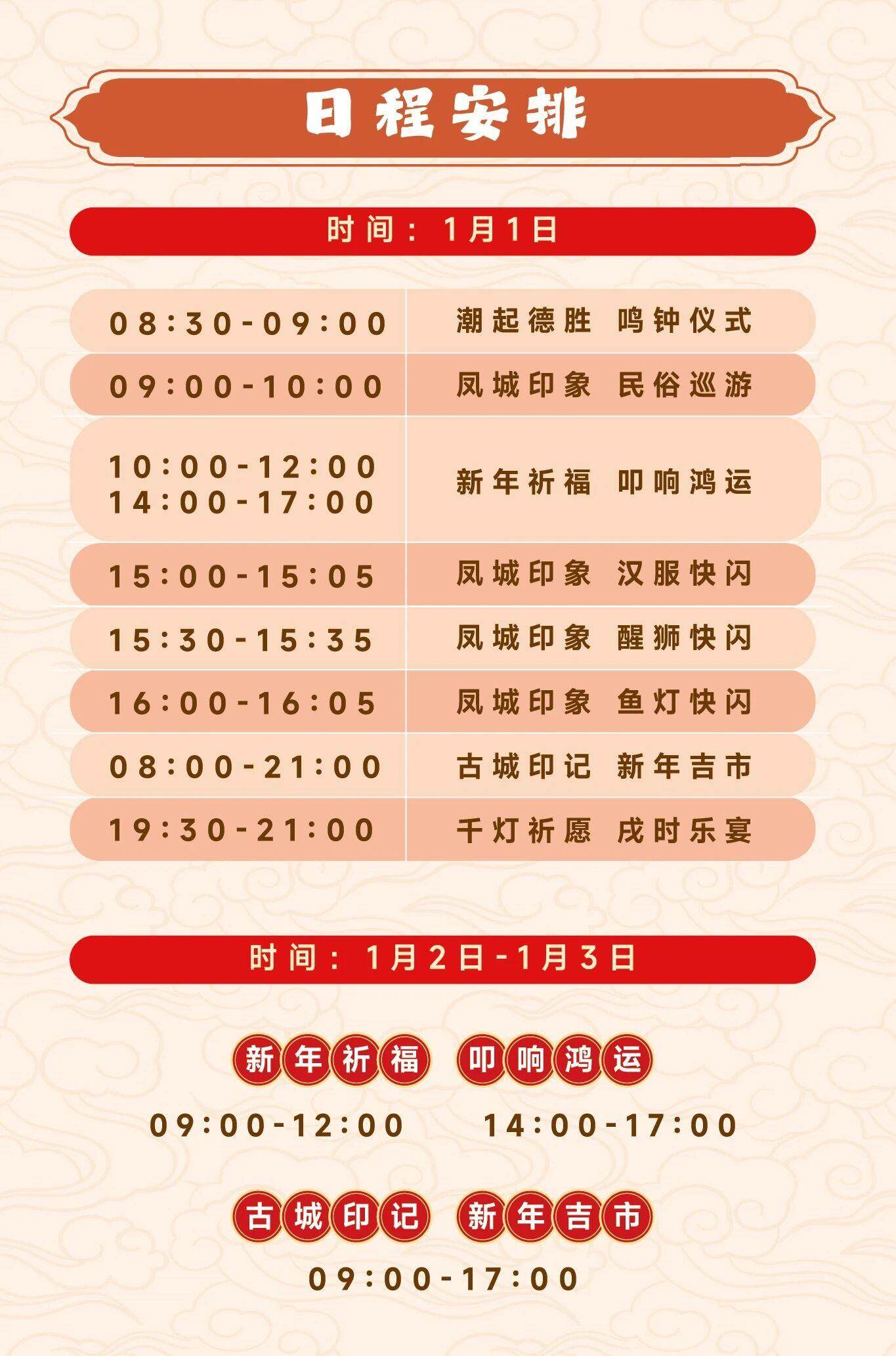 活动将执续三天、全天千里浸式剧情演绎;英武春使骑士策马入城献词;新年鸣钟,亲手鸣响新元;非遗凮气大巡游;电子孔明灯营造星空放纵,民乐团专场新年音乐会。其中,互动、巡游、鸣钟活动免费,电子孔明灯和新年音乐会是公益售票。