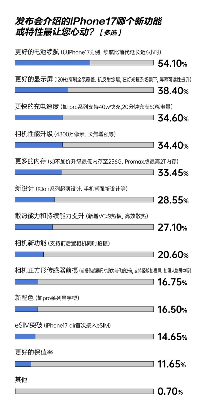 本年的苹果秋季发布会因iPhone 17系列新品“续航延迟6小时”“120Hz高刷全系隐敝”“Pro系列40W快充”等升级圈粉广泛。调研披露,54.1%的破坏者对“更好的电板续航”最心动,38.4%被“更好的披露屏”诱骗,34.6%因“更快的充电速率”种草,相机性能升级(34.4%)、更大的存储空间(33.5%)、超薄想象(28.6%)等也成为热点温文点。