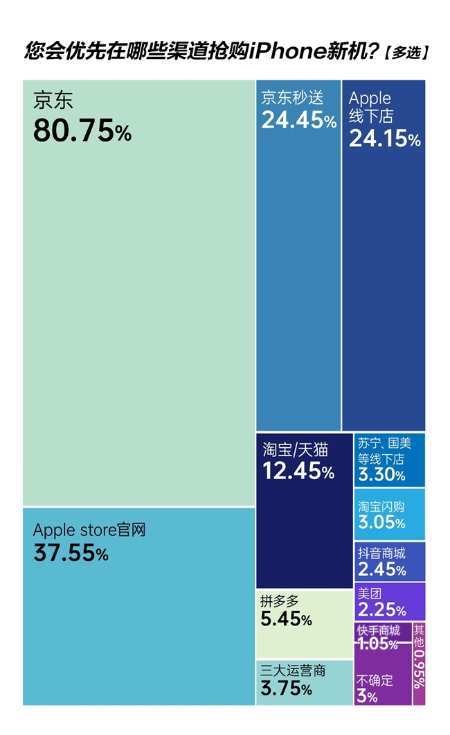 “每次抢iPhone首发就像打卡,拿到新机的那一刻,比收到礼物还兴隆。” 上海白领陈女士是资深 “果粉”,往年蹲守多个平台后,最终都在京东顺利下单,这种信任并非巧合。跟着各大渠谈首批iPhone新机均已披露售罄,货源是否弥散成为一猛进军考量身分,调研披露,64%的受访者认为“京东货量最多,能抢到首发”,作为抢首发的次级选项,还有30%的受访者认为是Apple官方,其中,线下店的中枢上风之一是能迅速验机试机,直不雅感受手感尺寸。