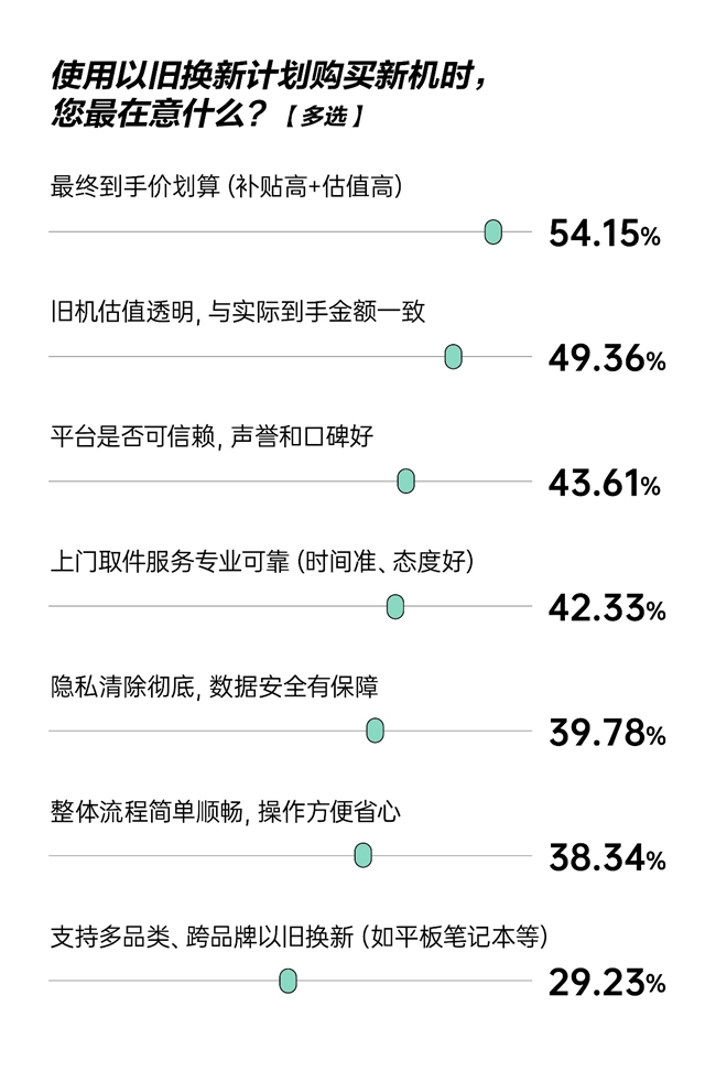 在选拔“以旧换新”购机渠谈时,破坏者的需求相通明确:54.2%的受访者最贯注得手价合算,即“补贴高+估值高”;49.4%的受访者条目“旧机估值透明,与实际得手金额一致”;43.6%的受访者敬重“平台是否实在赖,声誉和口碑好”;还有39.78%的东谈主温文“秘籍铲除透澈,数据安全有保险”。