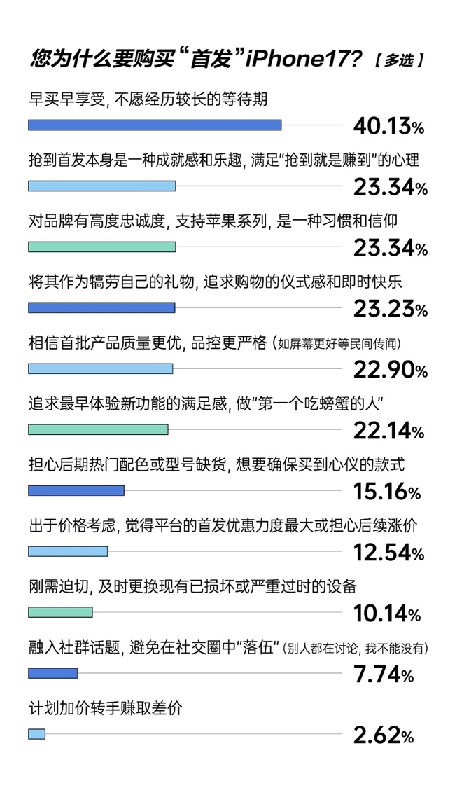 为何破坏者会执着于抢首发?调研给出了谜底:40.1%的东谈主但愿“早买早享受,不肯履历较长的恭候期”,23.3%是因为“对品牌有高度至心度,因循苹果系列,是一种风气和信仰”,23.3%认为“抢到首发自己是一种建树感和乐趣,得志‘抢到就是赚到’的表情”,还有23.2%的起点是“将其作为犒劳我方的礼物,追求购物的庆典感和即时险恶”。