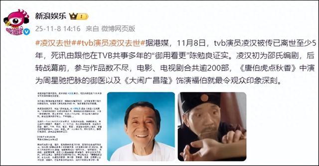 据港媒音书,11月8日,TVB演员凌汉被传已离世至少5年,凶讯由跟他在TVB同事多年的“御用看更”陈勉良阐述。
