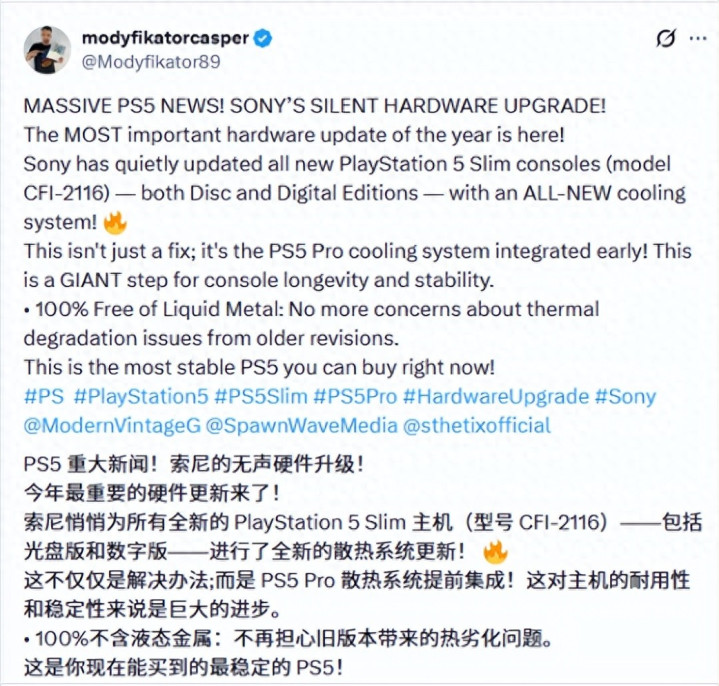 2025年11月30日,来自硬件圈的拆解信息揭示了索尼对PS5 Slim主机的一次要津性硬件迭代——型号为CFI-2116的光驱版与数字版机型,悄然完成了散热系统的全标的升级。这次时弊最值多礼贴的突破,是将底本为高阶机型预留的新式散热架组成功下放至主流Slim型号,成为今年度PlayStation硬件体系中最具重量的期间优化看成。