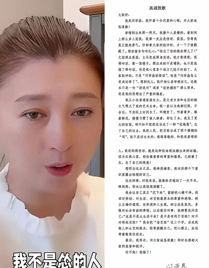 就在这时,闫学晶终于“折腰”了。1月11日晚,她在一又友圈发了篇手写长文,怀着“千里重的心思”憨厚谈歉,说我方是世俗家庭出来的孩子,一时朦拢忘了根基,还把之前骂东谈主的“酸黄瓜”改成了“老匹夫”,应允以后要多作念对社会有意的事情。