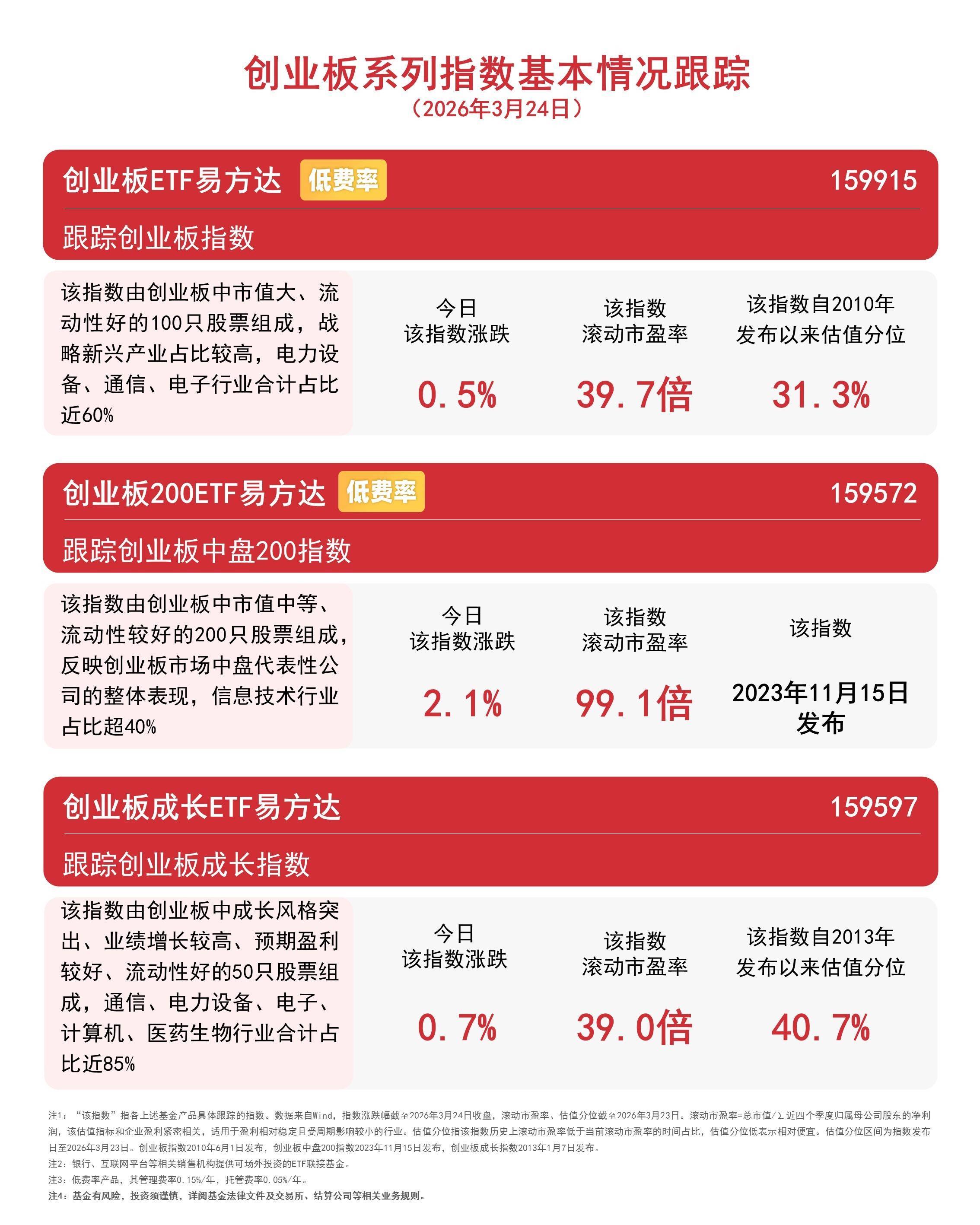 资金面潜入,创业板 ETF 易方达(159915,联结基金 A/C/Y:110026/004744/022907) 全天成交额近 50 亿元,同期获 5500 万份净申购,交投活跃度与资金招供度突显。且该家具为低费率品种(惩处费 0.15%/ 年 + 托管费 0.05%/ 年)。
