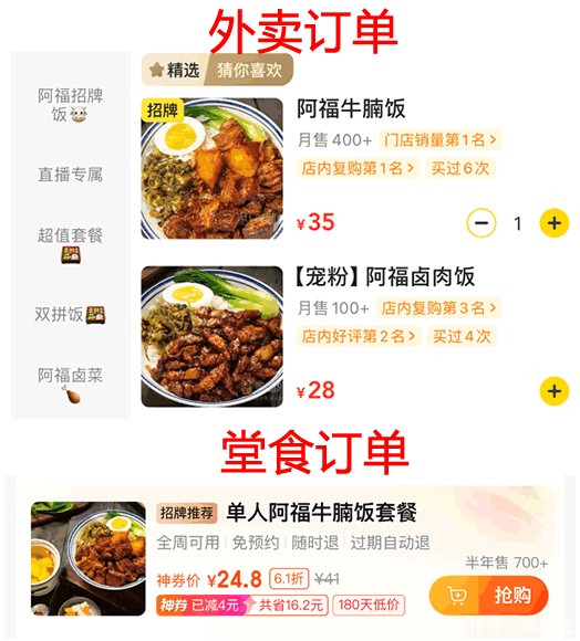 (1)松松最爱吃的阿福牛腩饭,昔日是外卖是28.8一碗,当今外卖加价到35元,堂食是24.8元(外加鸡汤一份、辣椒酱无尽量)。